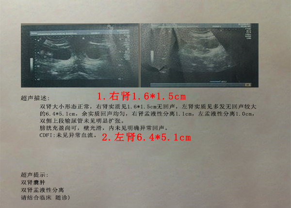 检查报告上显示是肾囊肿,左肾6.4*5.1cm,右肾1.6cm*1.5cm的囊肿。